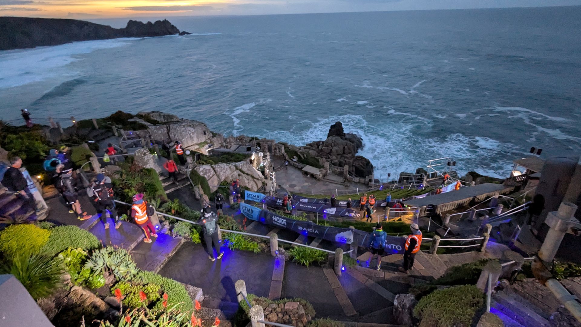 Der Start befindet sich direkt im Minack-Theatre und könnte spektakulärer nicht sein. Ich stehe auf der Tribüne und warte auf den Start um 8:30 Uhr während ich aufs Meer hinausblicke. In zwei Wellen in 15 Minuten Abstand macht sich das Feld sogleich auf den beschwerlichen Weg zurück zum Zielort Porth Towan. Glücklicherweise darf ich aufgrund meines UTMB-Indexes in der ersten Welle starten. Dadurch habe ich zum einen weniger Stau, da die vordere Hälfte einfach schneller ist, zum anderen habe ich auch eine viertel Stunde länger Licht. Denn eines ist sicher: Ich werde erst weit nach Einbruch der Nacht im Ziel ankommen.